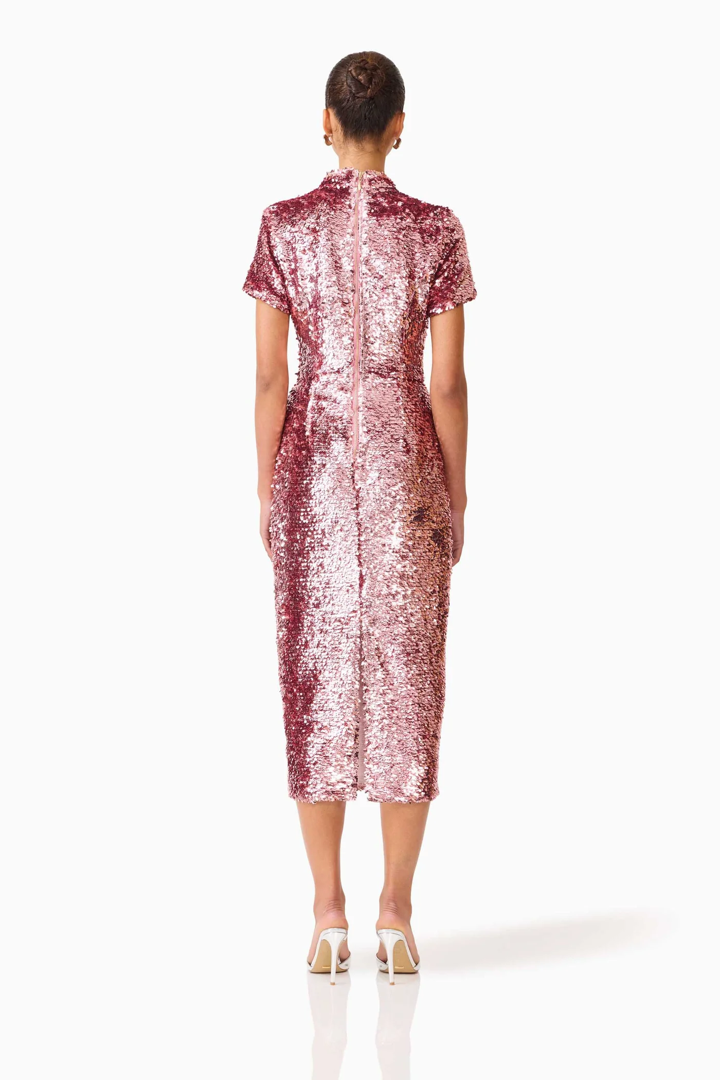 Turn heads at any event with the Alissa Sequin Midi Dress in Pink, a sophisticated choice for parties, dinners, or special occasions. This fitted midi dress is designed to flatter every curve while offering comfort, thanks to its stretch mesh sequin fabrication that provides just a little give. The high-collared neckline frames the face elegantly, while the short sleeves add a balanced, modern touch that complements the dress’s sleek silhouette.