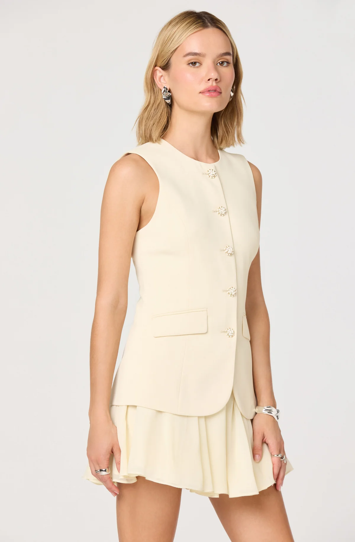 This contrast vest mini dress features a tailored vest bodice paired with a breezy chiffon skirt for a chic layered effect. A versatile style that works effortlessly from the office to evening plans.