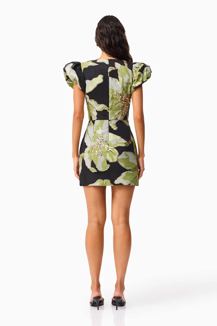 Chic and romantic, the Elysia Cap Sleeve Mini Dress in Black & Green Floral is a standout piece for garden parties, cocktail evenings or special occasions. Crafted from a floral jacquard fabrication, the intricate woven pattern adds subtle texture and depth to its timeless silhouette.