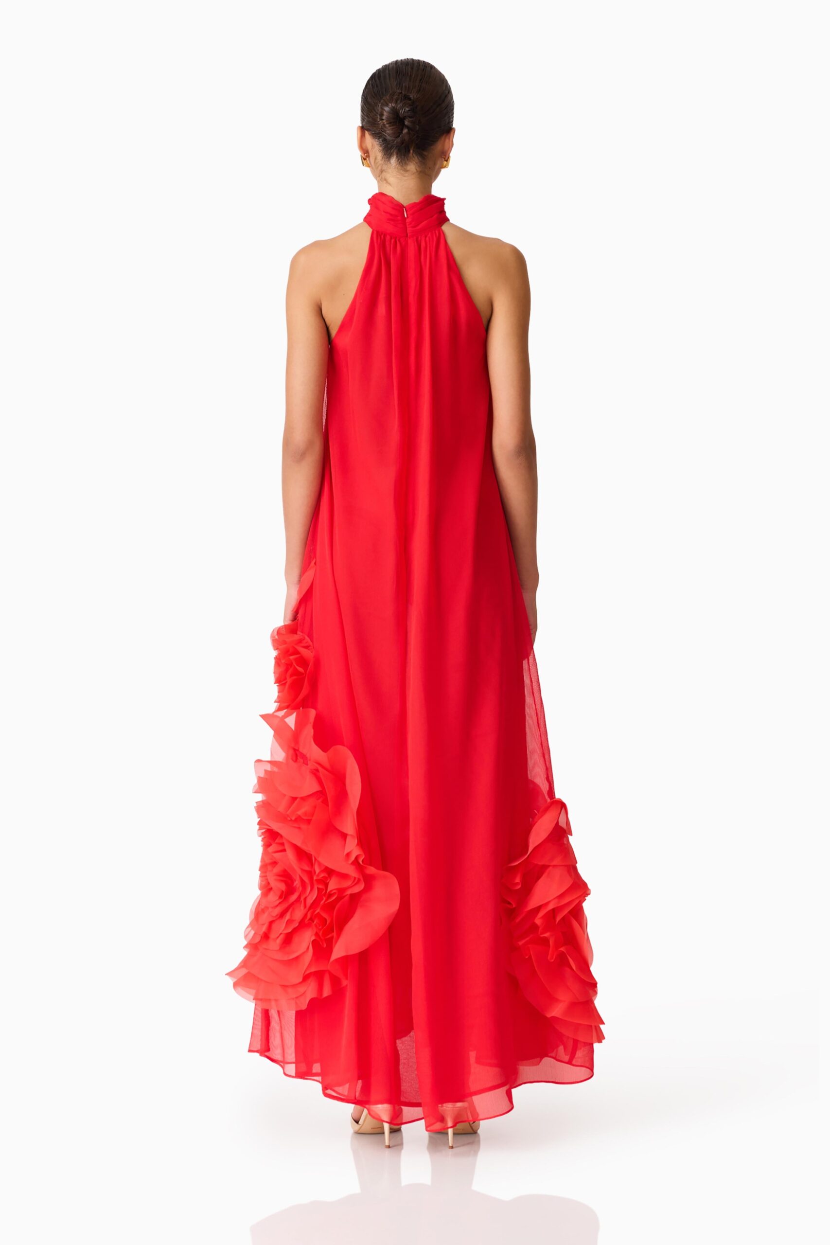 Perfectly suited for red carpet events, evening parties, or black-tie weddings, the Evelin Halter Gown pairs beautifully with statement heels and minimal jewelry, allowing the intricate flowery details to take center stage. This gown balances dramatic style and understated sophistication, making it a timeless addition to any formal wardrobe.