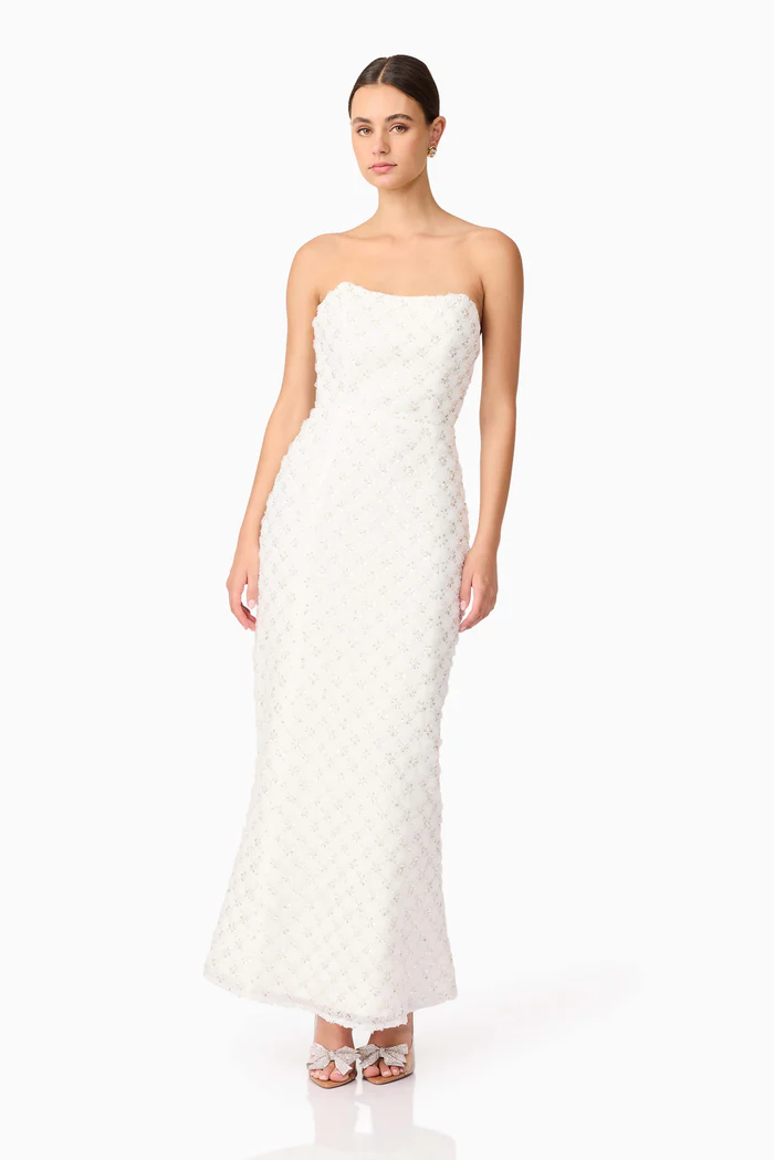 Make an unforgettable entrance in the Lola Strapless Gown in White, a stunning strapless maxi dress designed for effortless elegance. Crafted with a fit and flare style, this gown cinches at the waist and flows into a gracefully draped full-length skirt, creating a flattering and timeless silhouette. Delicate pearl and sequin detailing add a touch of shimmer, elevating its sophisticated appeal.