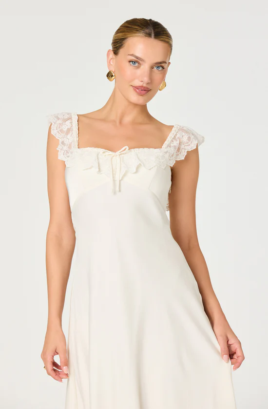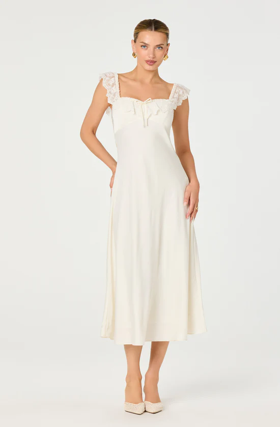 Embroidered lace straps and a sweetheart neckline bring romantic elegance to this satin midi dress. The empire waist and bias-cut skirt create a flowing silhouette, while adjustable ribbon tie at center front and darted bust ensure a flattering fit.