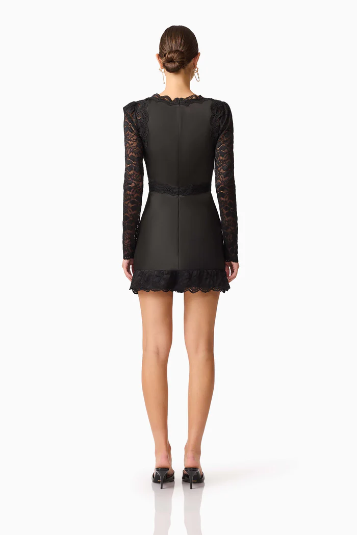 Understated sophistication meets after-dark allure in the Margot Long Sleeve Mini Dress in Black. Designed in an elegant lace and satin fabrication, this elevated mini dress combines structure and softness for a refined eventwear moment.