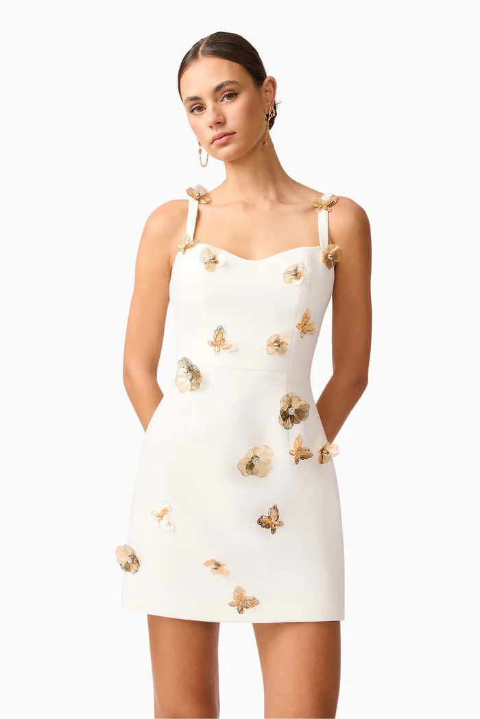 The standout feature? Delicate 3D flowers and shimmering metallic butterflies are appliquéd across the bodice and skirt, adding a dreamy, whimsical finish to this crisp white look. Whether you’re dressing for an engagement party, garden event, or bridal moment, this dress brings a touch of magic to any special occasion.