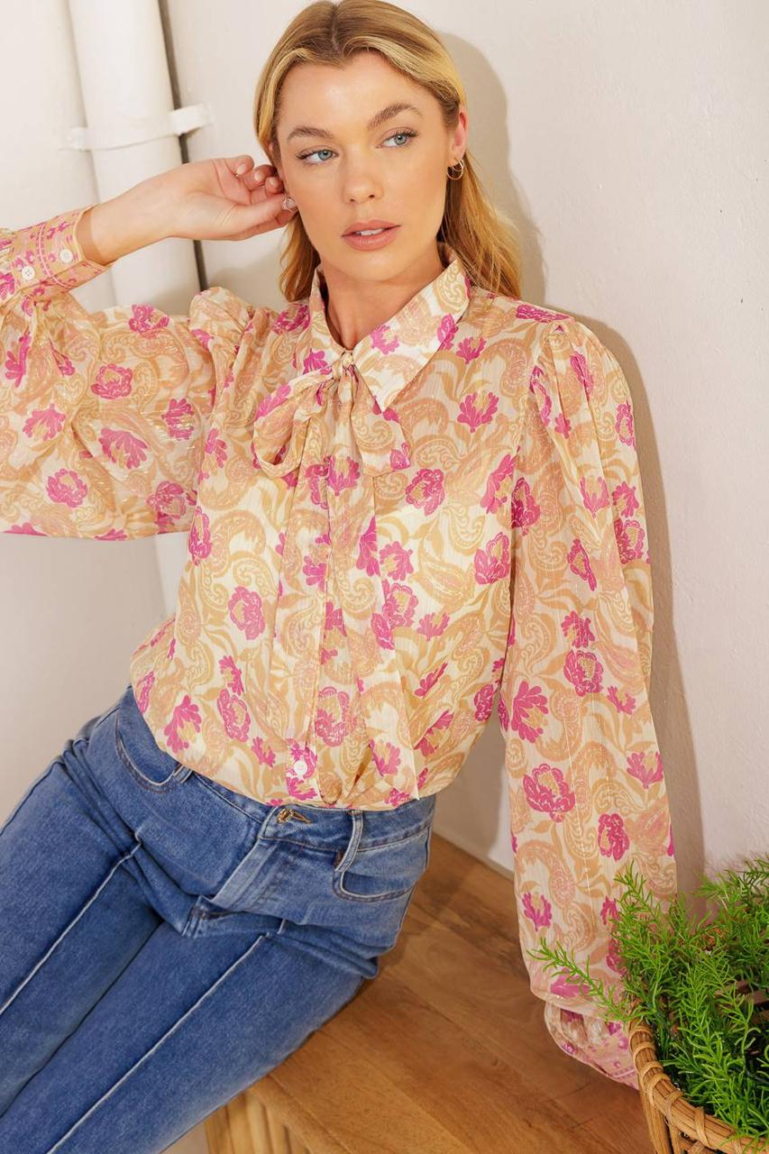 Ria Rose Print Tie Front Button Up Shirt
