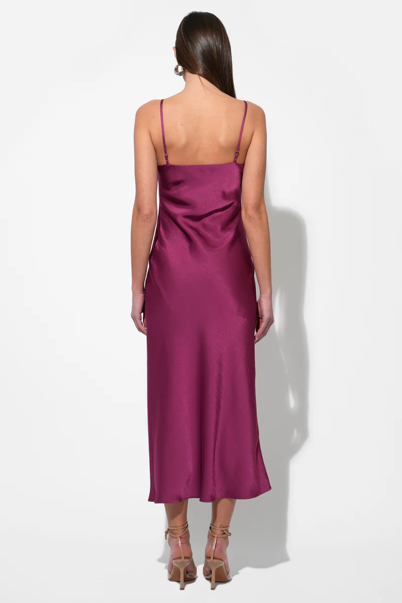 This stunning midi-length slip dress, in a captivating vibrant pink hue, drapes beautifully to flatter every curve. It features a luxurious cowl neckline that softly cascades, exuding refined allure, and delicate spaghetti straps for a minimalist yet chic appeal.