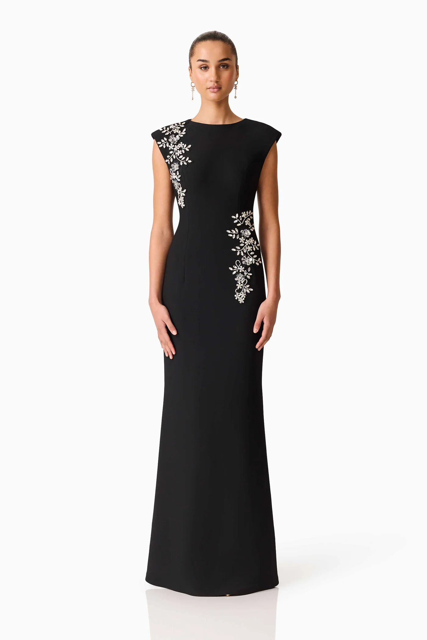 The Veda Embellished Gown in Black is perfect for those seeking timeless evening elegance with a modern, flattering shape and delicate sparkle.