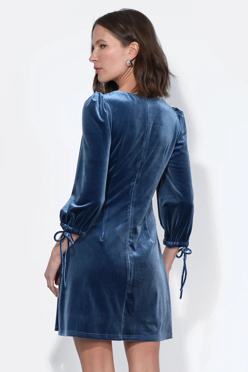 This stunning mini dress, in a delicate icy blue hue, is crafted from a luxurious, soft velvet fabric that drapes beautifully. The design features a chic halter-style neckline that creates an elegant silhouette.